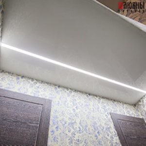 Так как прихожая – это помещение без естественных источников света, то для нее рекомендуется выбирать глянцевые полотна, который отражают свет, и эксклюзивные покрытия с эффектом мерцания. Для организации освещения самым модным и практичным вариантом является парящая линия. Независимо от того, какой формы и размера ваша прихожая, парящие линии обеспечат достаточное освещение в ней. Кроме этого, рекомендуем рассмотреть различные модели встроенных потолочных светильников.